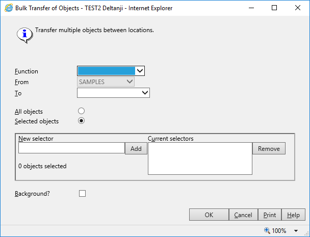 - Choose whether to transfer all objects that are present at the from-location, or whether to enter selector patterns using the next region of the dialog.