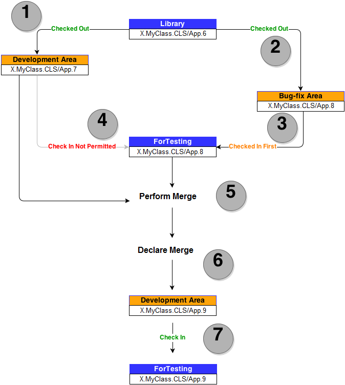 - Developer2 then checks the same object out to the Bug-fix Area, creating the new object version X.MyClass.CLS/App.8.