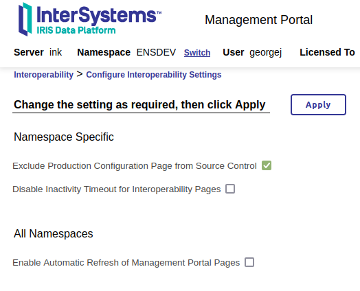 In order to use the Production Plugin to manage Configuration Items it is necessary to disable normal class based source control for the Production Configuration page. This needs to be done once for each namespace where you want to use the Plugin. The following steps explain how to do this: