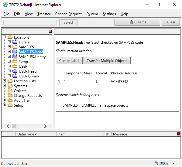 Each location folder can be expanded to show the next level of the tree. The next level typically has three folders (views): objects, change requests and components. Each of the views displays the contents of the location in a different way.