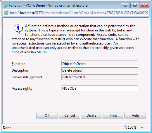 Access rights can be attached to any function to restrict who can execute that function. A function with no access restrictions can be executed by any authenticated user. An unauthenticated user can only access methods that are explicitly given an access right of ANONYMOUS, but do not assign this access right unless advised to do so by support personnel.