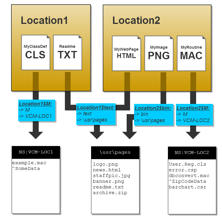 In this diagram, the two locations - Location1 and Location2 - map to the following four physical locations.