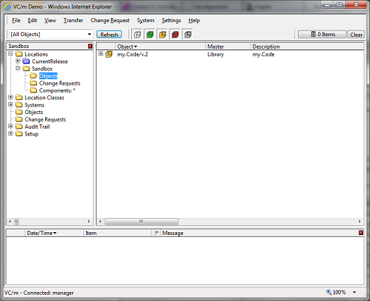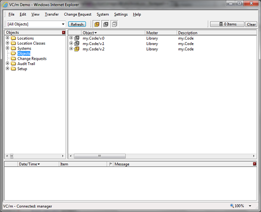 When the object folder is selected for a location, all the object versions which are at that location and which match the selection criteria are displayed in the main panel. The selection criteria can be changed on the select toolbar.