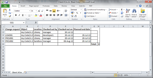 This report is a spreadsheet with rows displaying details about each object which has its master version in the selected location(s). Objects are grouped by change request and the report may be limited to contain only those change requests overdue by a specified amount or more.